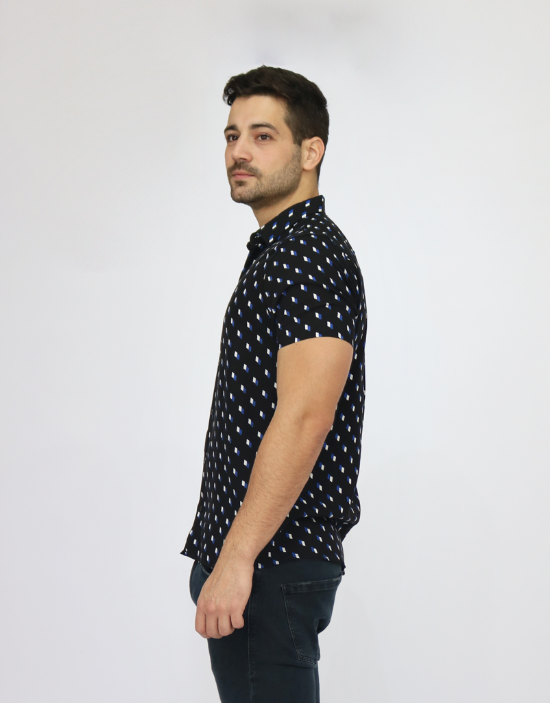 Nossa camisa de viscose com estampa de retangulos são uma excelente opção pra quem tem muito estilo e quer se vestir bem. Com um fundo preto e desenhos azuis e brancos, mesmo sendo estampada é super discreta. Feita em tecido 100% viscose, ela é super confortável e fresca, ideal para usar em dias e noites quentes.